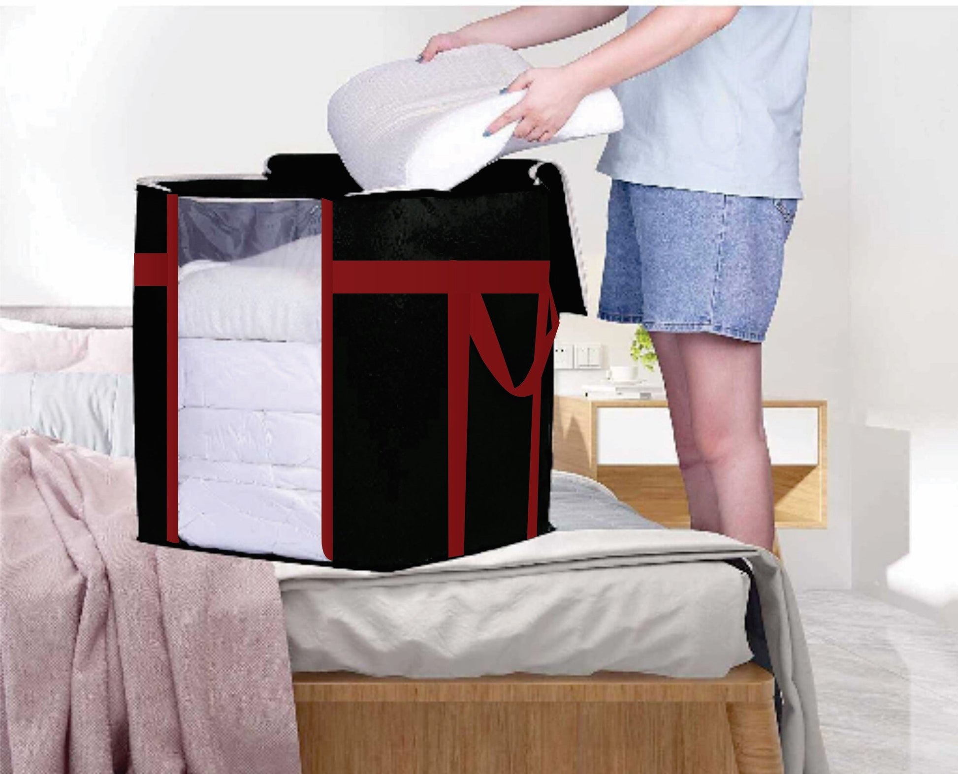 HomeOptions' multifunctional bags are designed to accommodate groceries, makeup, clothes, shoes, and various dry items. Whether you're traveling or organizing seasonal belongings like blankets and clothes in your wardrobe, these bags prove to be the perfect solution. Conveniently fold and stack them in a drawer when not in use, maximizing space and keeping your belongings tidy. Versatile and durable, HomeOptions' bags offer the ultimate storage solution for your everyday needs, both at home and on the go. Experience the convenience and organization these bags bring to your lifestyle, making clutter a thing of the past.