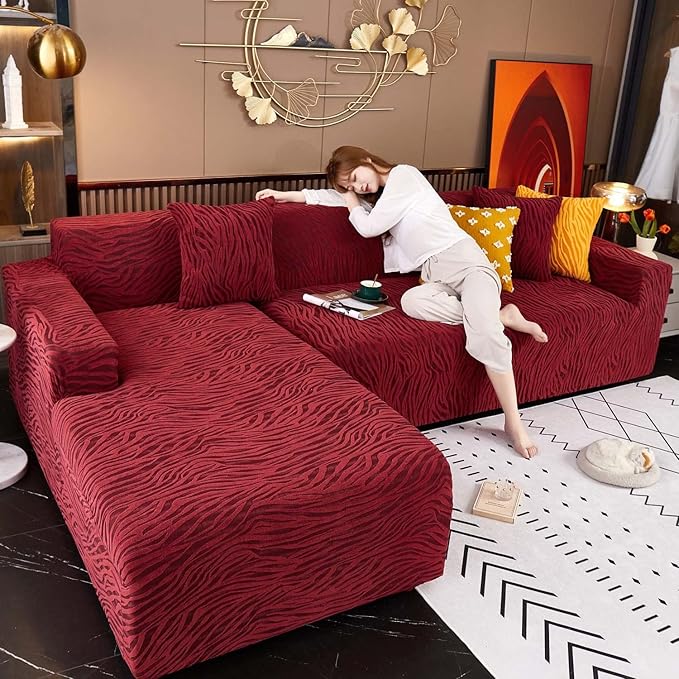 L Shape Zebra Velvet Sofa Covers - Fitted Style ( Maroon )